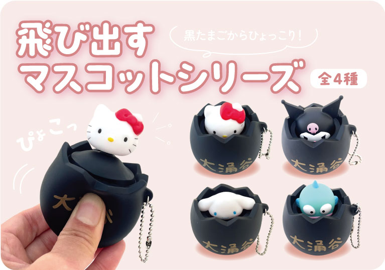 大涌谷くろたまご館 公式 箱根旅行・お土産・富士山大涌谷限定!大涌谷くろたまご館のサンリオキャラクターズグッズの中で人気ナンバー1の飛び出すマスコットシリーズです。黒たまごの殻を押すとキャラクターが飛び出す、ピョコッ!ピョコッ!楽しいグッズです。