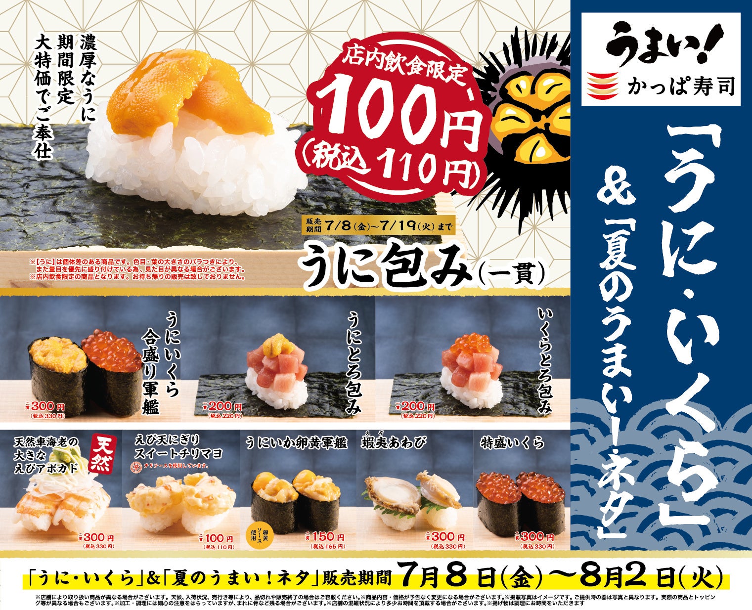 豪華ネタの「うに」と「いくら」を各一皿100円 税込110円 よりご提供 かっぱ寿司人気の祭りを2024年も開催『かっぱのうに&いくら祭り』カッパ・クリエイト株式会社のプレスリリース。