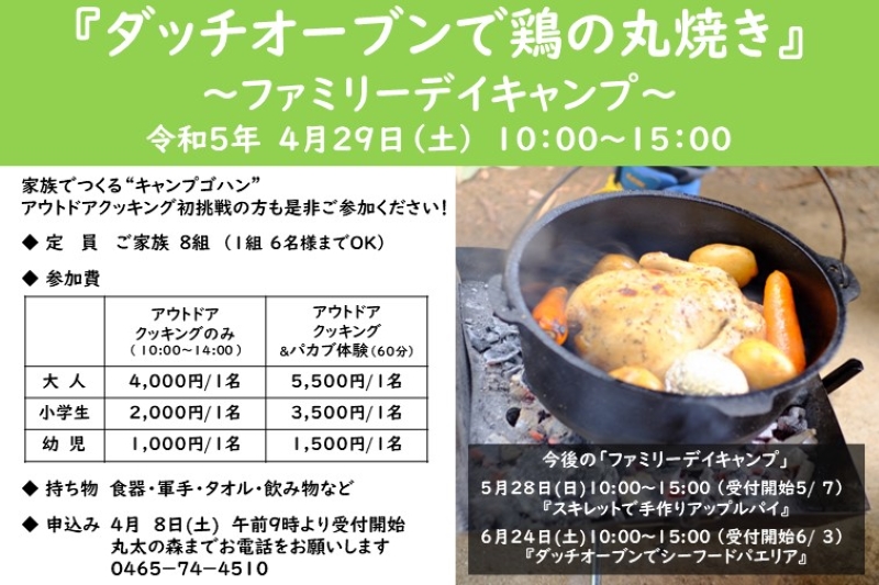 ファミリーデイキャンプ ~ダッチオーブンで鶏の丸焼きをつくろう~4月29日 土 開催のご案内 – 足柄森林公園 丸太の森。