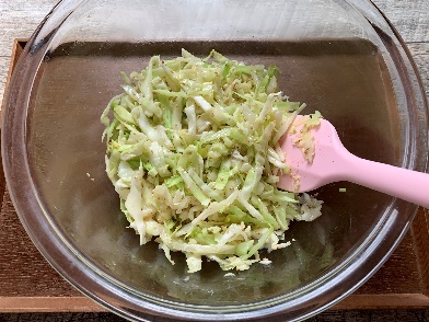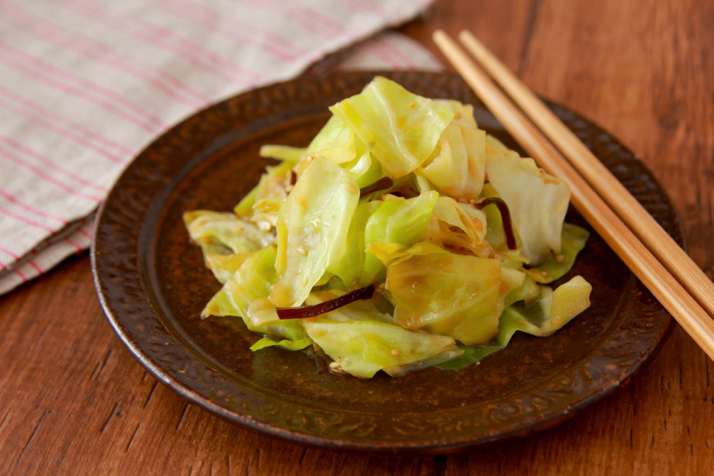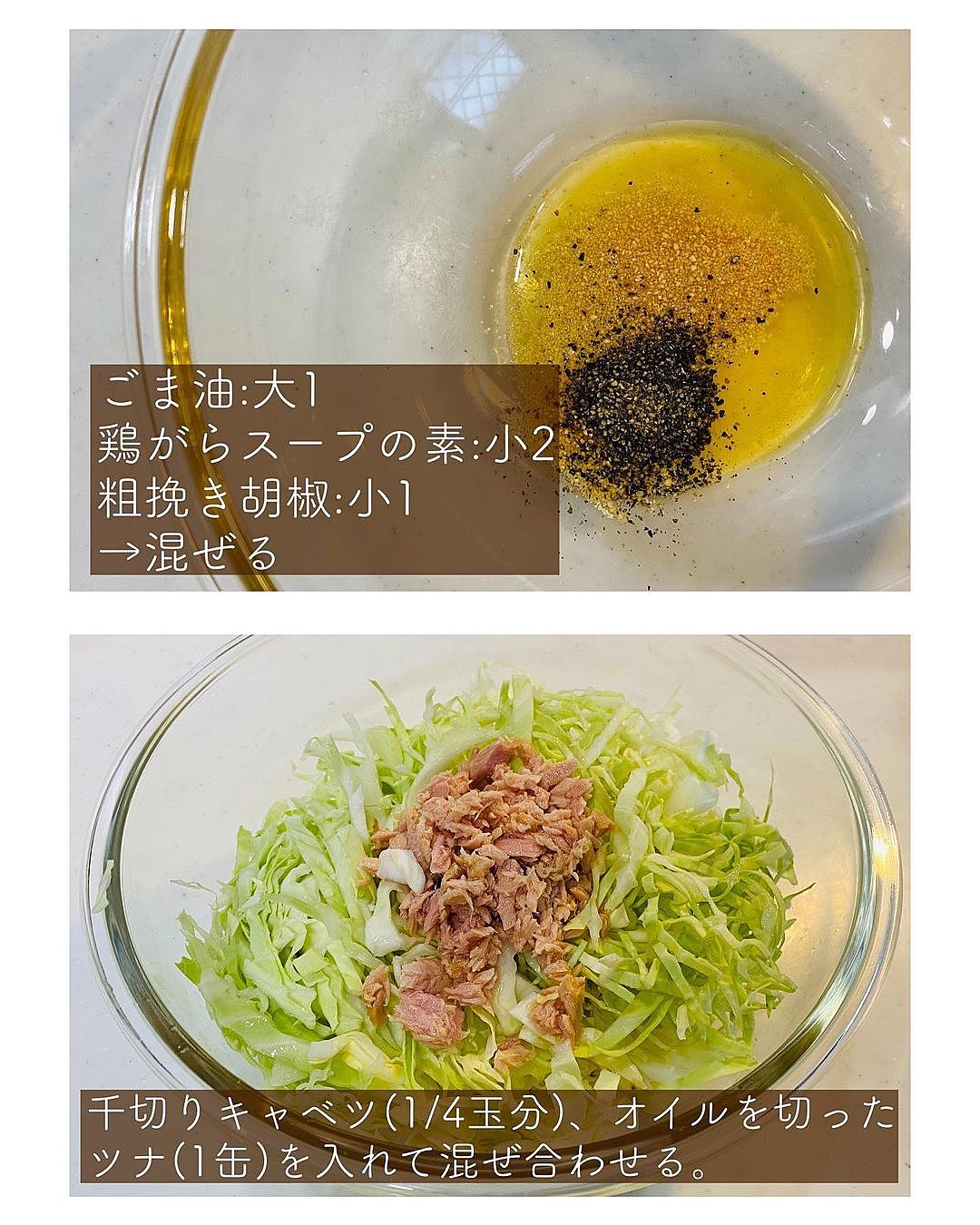無限キャベツ』 ①耐熱皿に入れた千切りキャベツ 1 4 玉分、ツナ1缶、鶏ガラスープの素・マヨネーズ・ ごま油を各小さじ1入れてよく混ぜる②ふんわりとラップをして600W のレンジで 2 分レンチン ③全体をなじませるように混ぜ、器に盛りつける ④コショウをふりかけ。