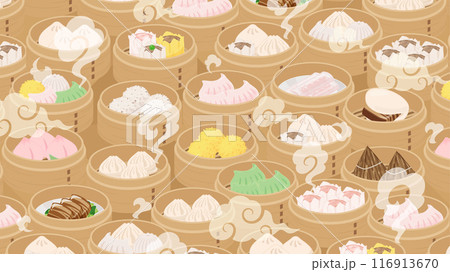 点心、中華料理。中国の伝統的な食べ物のベクターイラスト。白地にエビ餃子、ワンタン、揚げ春巻き、豚まん。中華料理のメニューコンセプトのイラスト素材・ベクターImage 195252287。