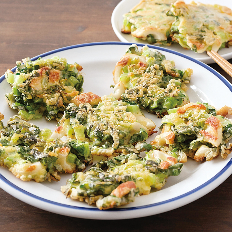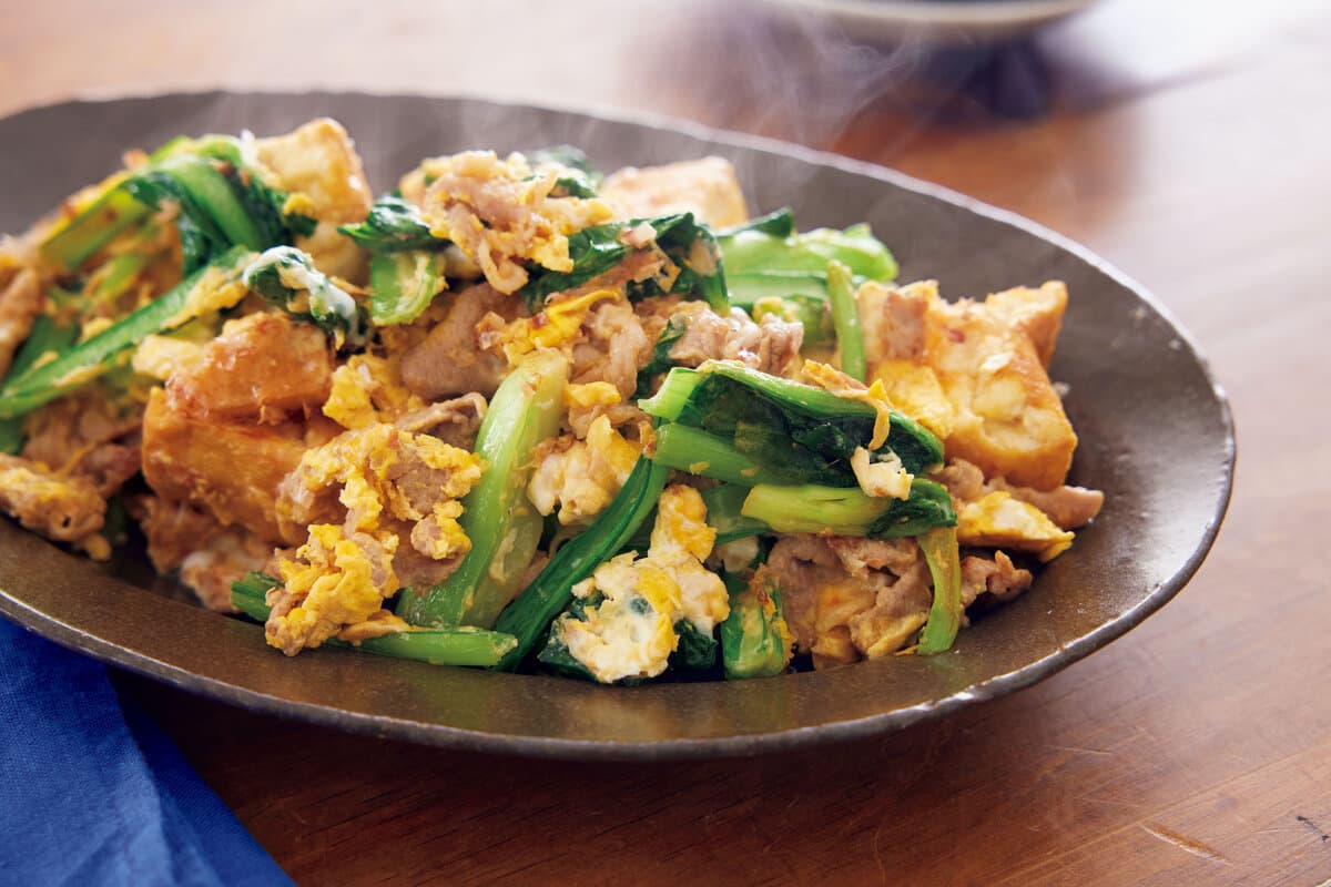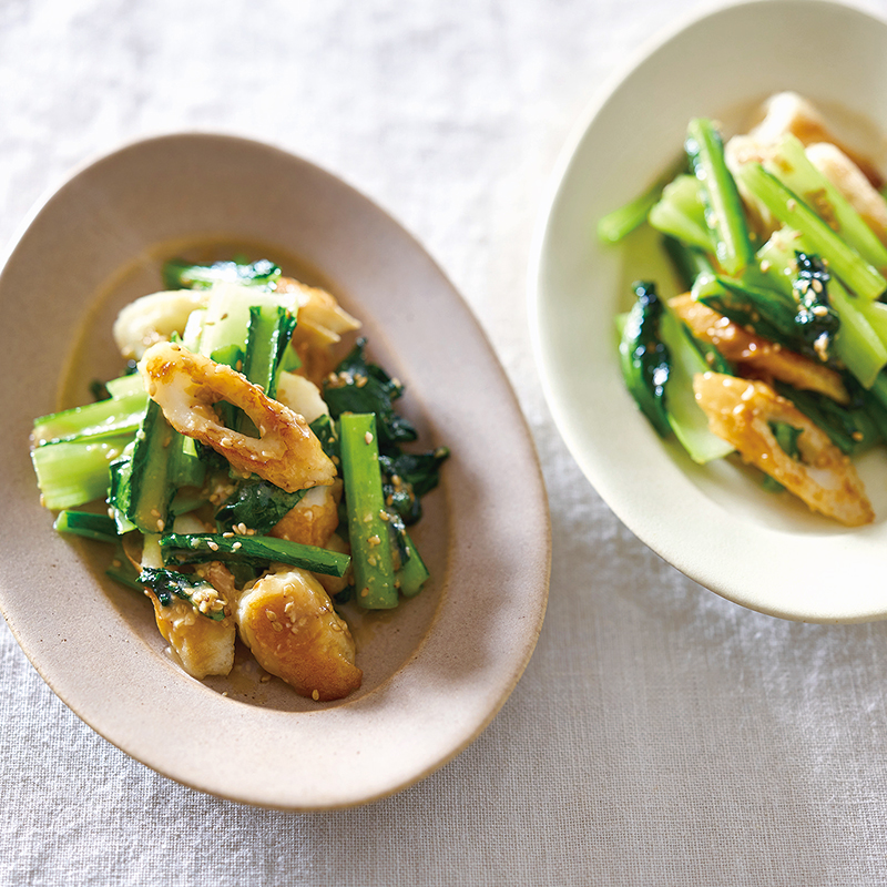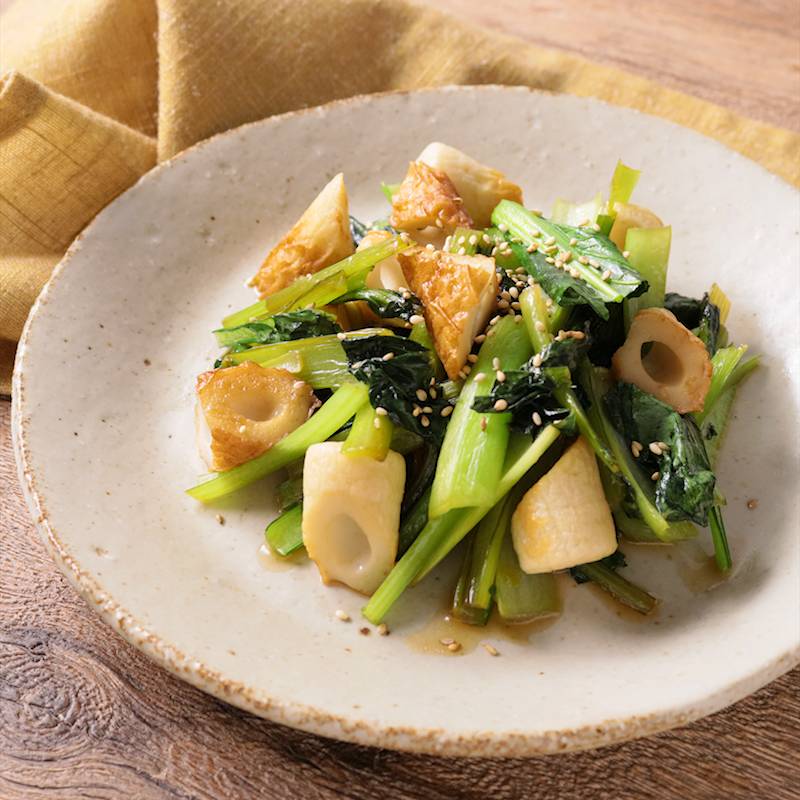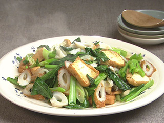 「キューピー3分クッキング」小松菜、ちくわ、厚揚げの塩炒め。