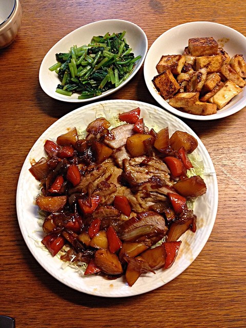 献立 豚の生姜焼き、厚揚げ焼きに茄子ともやしと生姜のせ、小松菜とちくわの煮浸し、カブのお漬物、昆布と人参と油揚げの炒め物、しらすおろし、もやしのお味噌汁: kajuの□今日のお料理・簡単レシピ□。