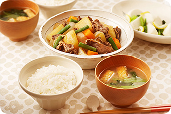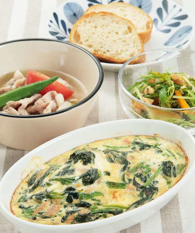 ほうれん草のキッシュの献立 主食:残り野菜で炊き込みご飯、汁物:たっぷりキャベツの梅風味スープ 献立 ・メニュー 味の素パーク たべる楽しさを、もっと。