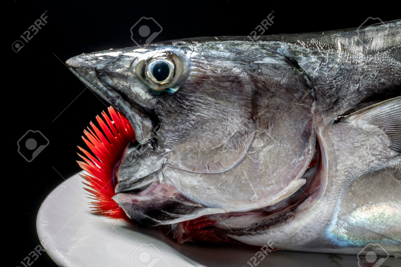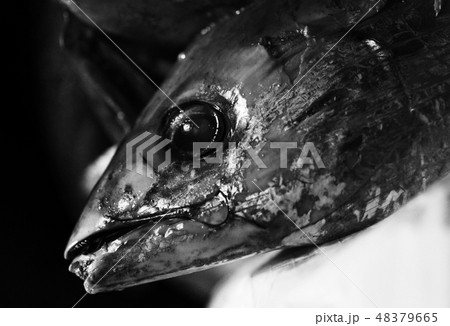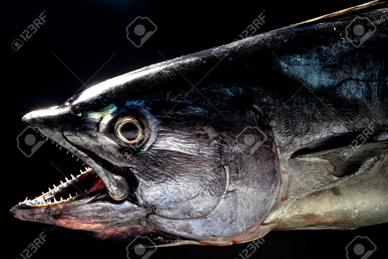 接写の詳細スタジオの黒い背景新鮮な生のカツオの頭の口を開けたポートレートの写真素材・画像素材 Image 192548706。
