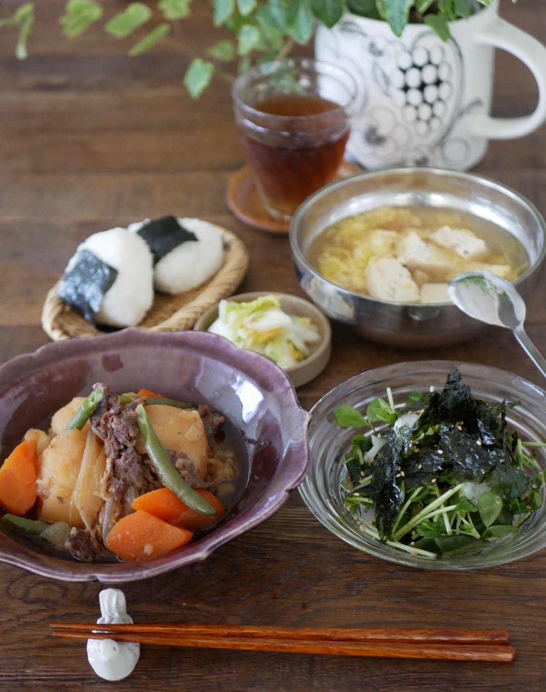 yayoi共働きのおうちごはんほったらかしで簡単!肉じゃが定食🥔 久しぶりにザ和食って感じのご飯食べたいな〜と思って肉じゃがを作りました◎ 1人ご飯の時ってあんまり牛肉買わないんだけどちょっぴり奮発です🐮 煮物は自分で煮るより圧力鍋の方が断然美味しく。