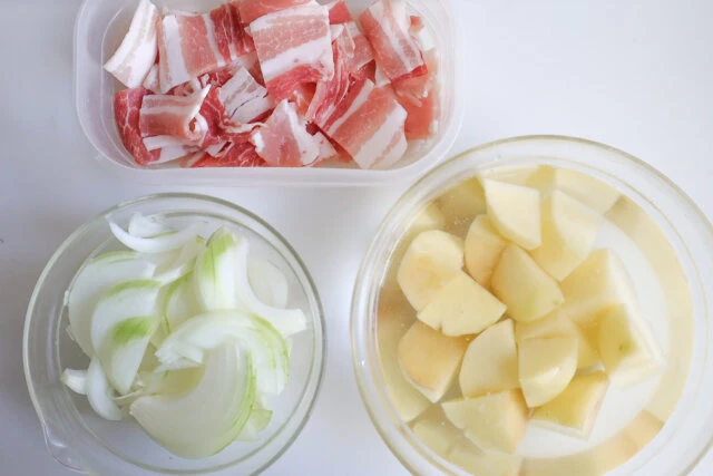 焼肉のたれで絶品肉じゃが , <材料 2人分 >, 豚バラ肉 薄切り 120g, じゃがいも2個 250g , にんじん1 3本 50g ,玉ねぎ1 2個 100g , 焼肉のたれ大さじ4, 水大さじ4, <作り方>,1.じゃがいもは皮をむいて一口大に切って水にさらし、にんじんは皮をむいて7mm幅のいちょう切りにし、玉ねぎは薄切りにする。,2.豚肉は3cm長さに切る。,。