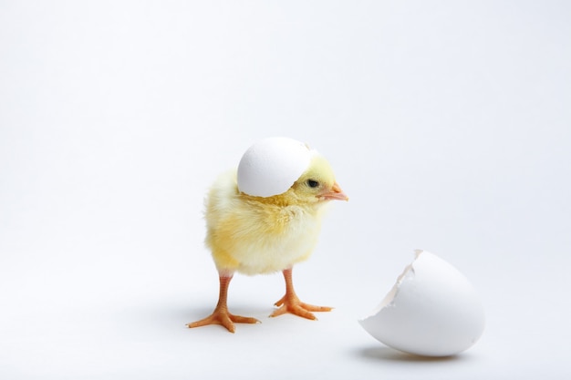 黄色の生まれたばかりのひよこと卵の殻Premium写真。