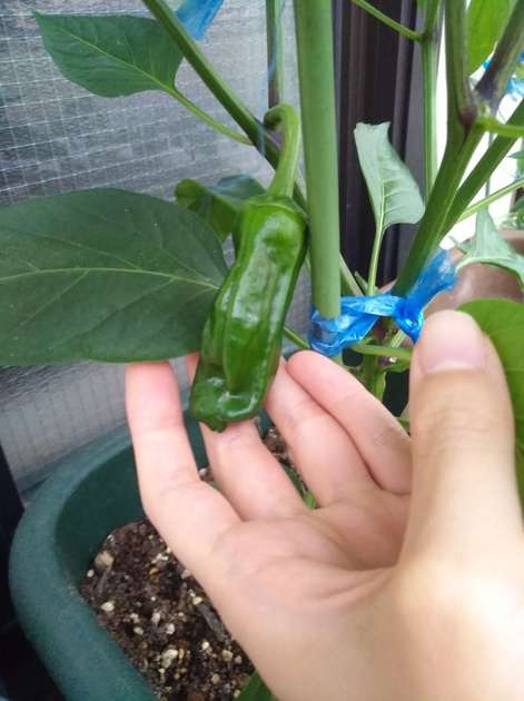 これはピーマ ん??ピーマンの苗を買ったはずが、シシトウに見える😂ピーマンとシシトウは、苗では区別がつかず、実がなるまで分かりませんよね。肥料不足かも?と淡い期待で追肥しましたが どうかな?🤔みんなとカゴメでつくるコミュニティ &KAGOME アンドカゴメ。