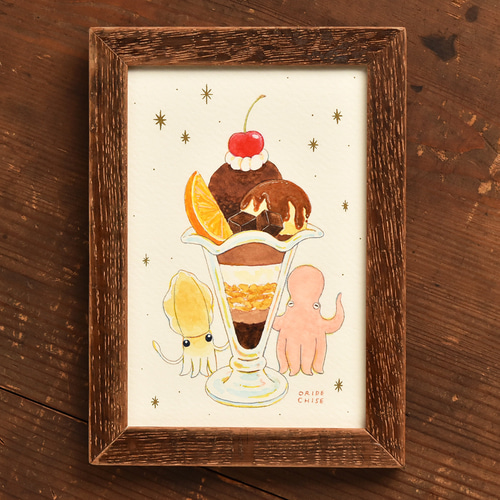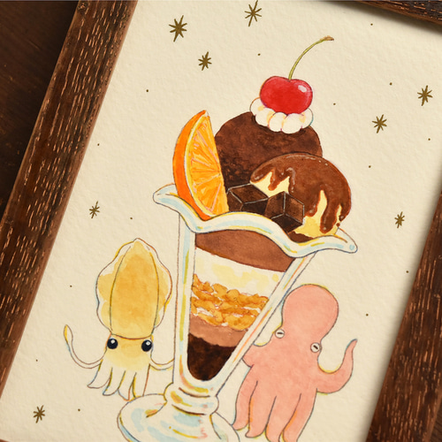 りんママさま 水彩原画『ねこパフェ』+『ねこチョコケーキ』。