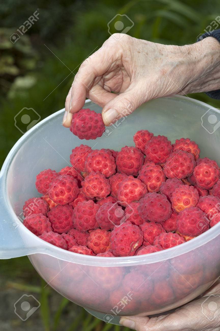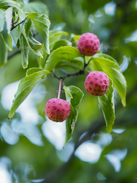 赤く熟した『ヤマボウシ Cornus kousa』の実。甘く食用。同属で花が似るハナミズキ アメリカハナミズキ32203018052 の写真・イラスト素材アマナイメージズ。