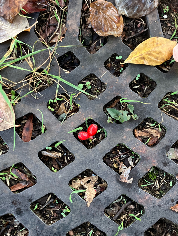 紅い実 ハナミズキ,ヒヨドリジョウゴ,ナンテン- 行く川の流れ。
