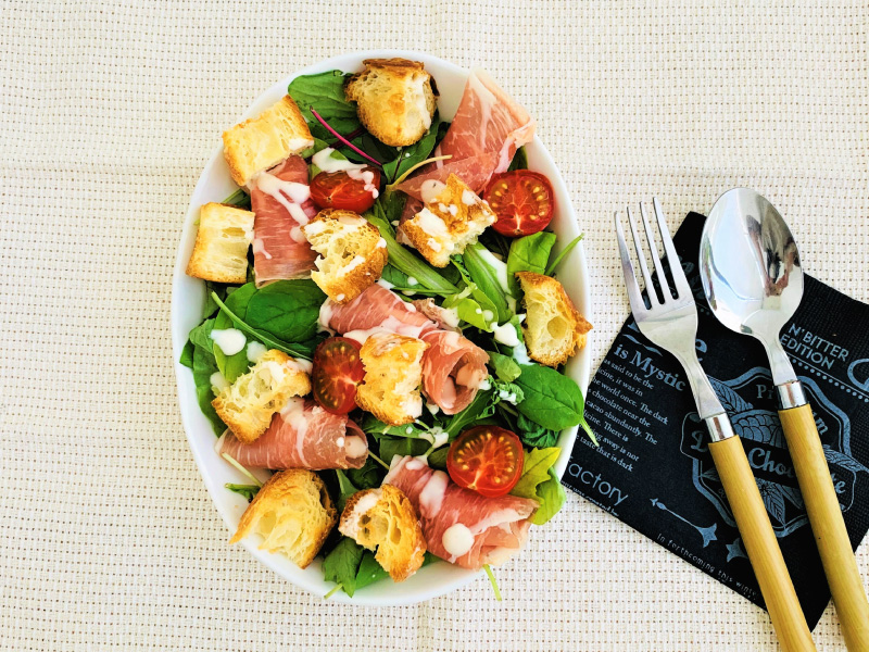 塩クルトンと生ハムのシーザーサラダお手軽アレンジレシピ 株式会社コモ。