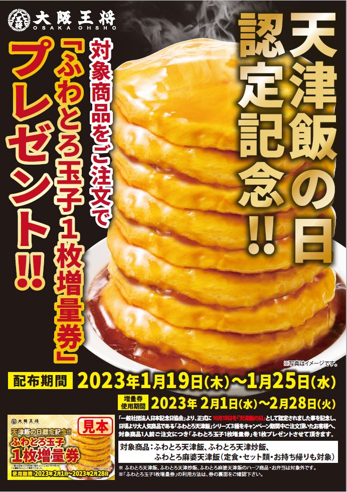 大迫力のビジュアル!玉子タワーが実現~大阪王将・『天津飯の日』認定記念!!ふわとろ玉子増量券プレゼント株式会社イートアンドホールディングス。