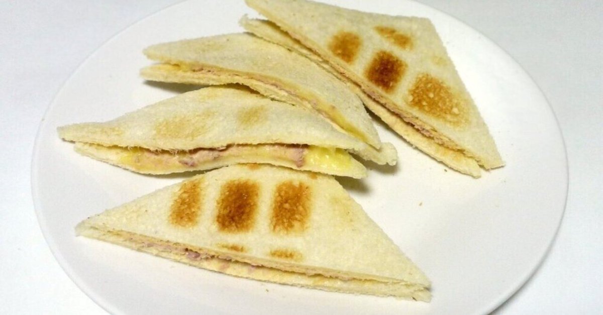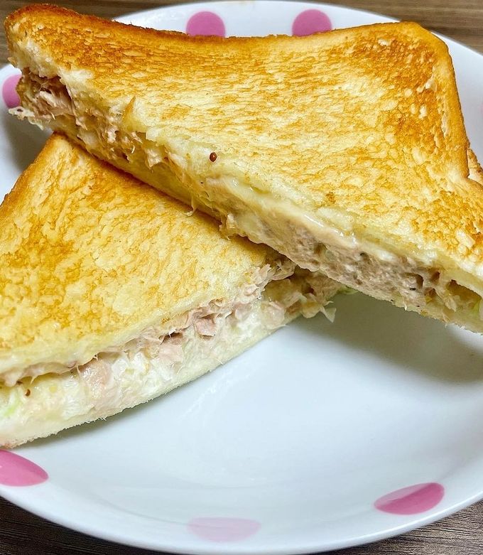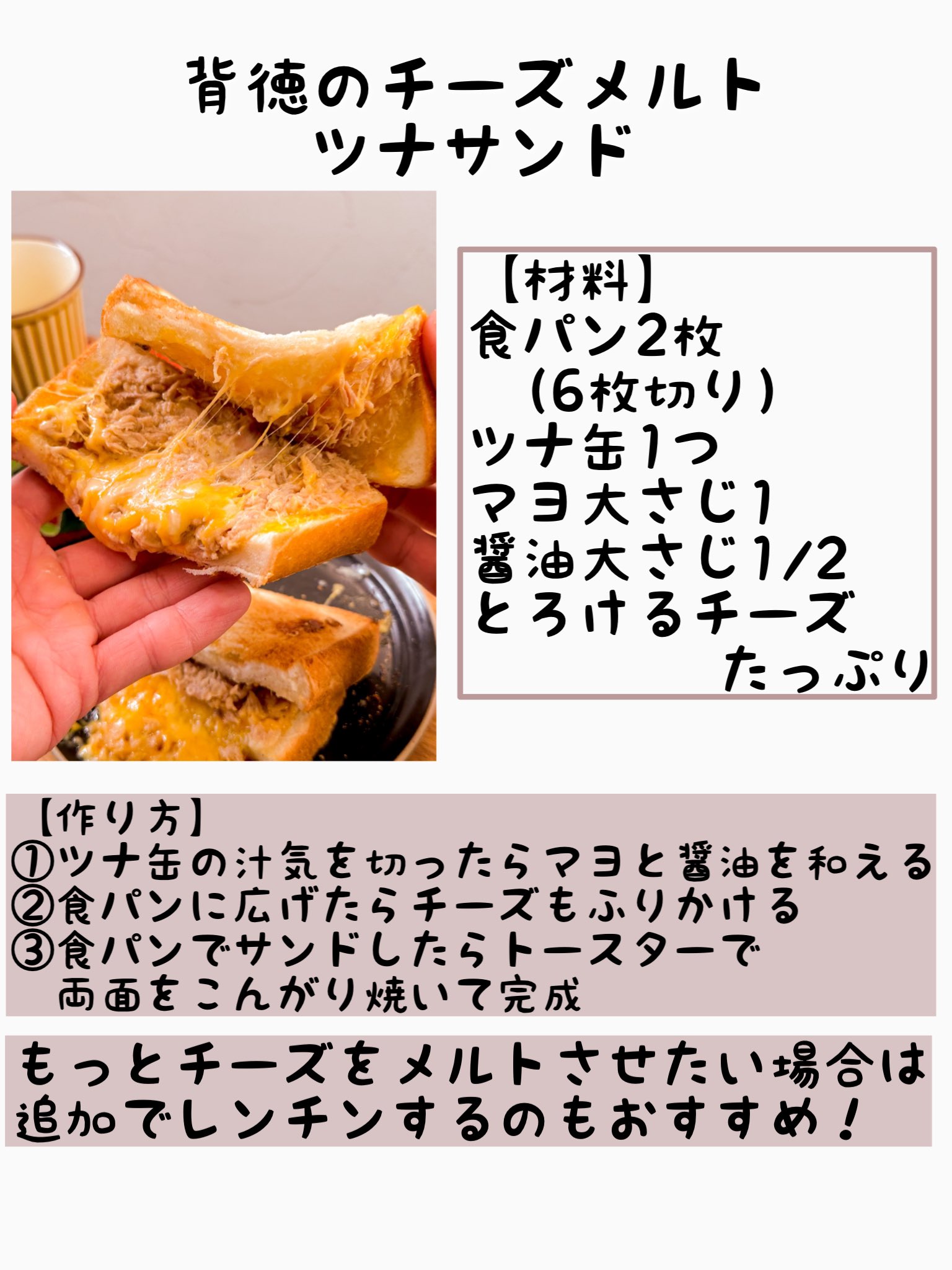 背徳のチーズメルトツナサンド , ツナマヨサンドはチーズと一緒に挟んで焼くことで優勝できます。,材料 , 食パン2枚 6枚切り , ツナ缶1つ,マヨ大さじ1, 醤油大さじ1 2, とろけるチーズたっぷり,作り方 , ①ツナ缶の汁気を切ったらマヨと醤油を和える,②食パンに広げたらチーズもふりかける, ③食パンでサンドしたらトースターで両面をこんがり焼いて完成,。