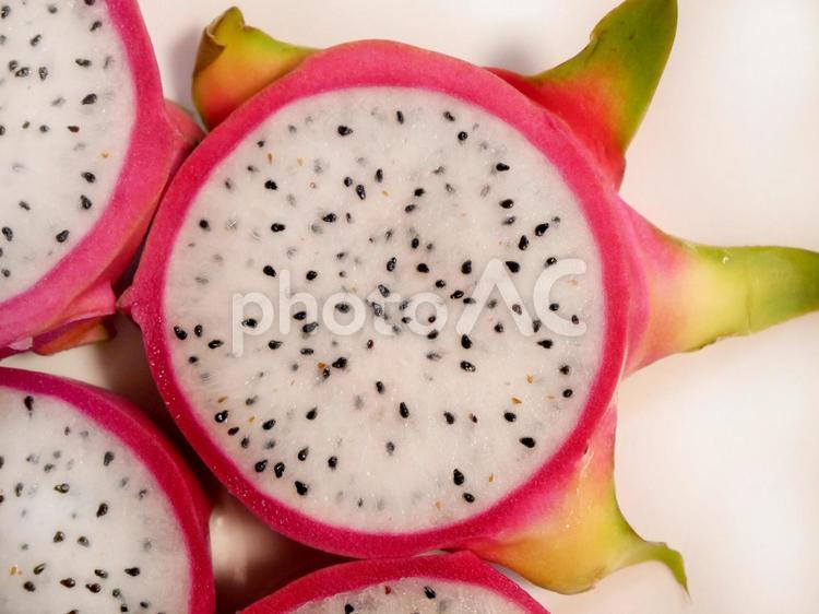 ドラゴンフルーツ ドラゴン フルーツ 果物 南国 南の島 スライス カット面 スライス面 切断面 面 表面 鮮やか ピンク 緑 グリーン 美味しいおいしい たべもの デザート カット 白 種 プツプツ ブツブツ たね ホワイト 黒い種 黒 ブラック - No:。