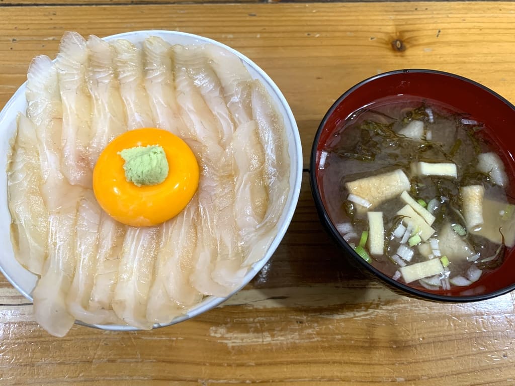 ヒラメ漬け丼ヒラメ漬け丼せんべい汁セットみなと食堂みなと食堂の平目漬け丼ヒラメ漬け丼とせんべい汁セット。