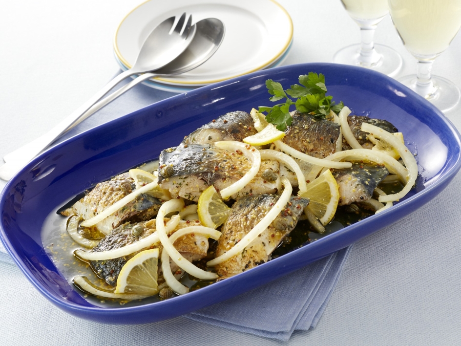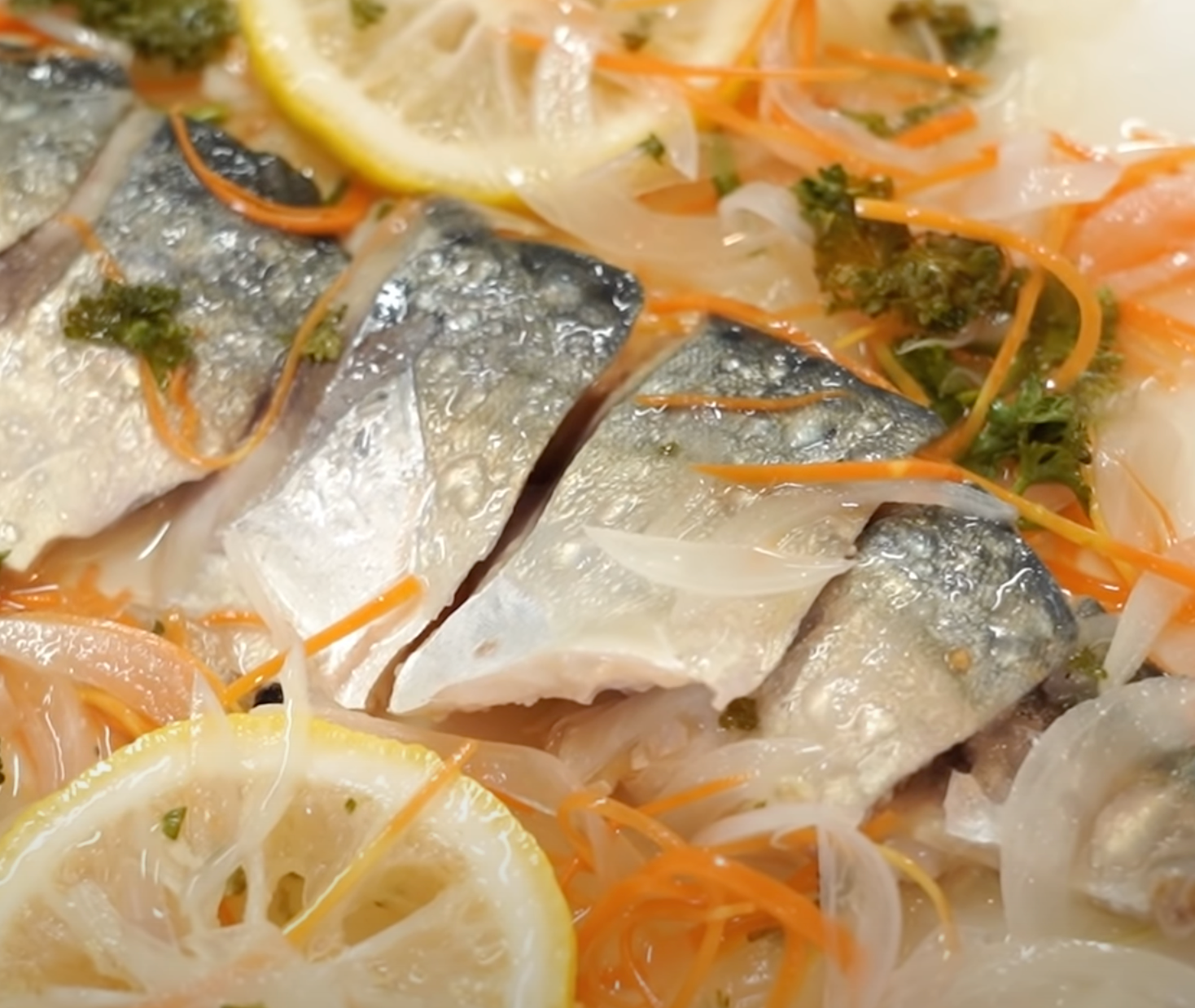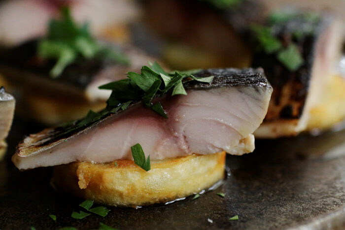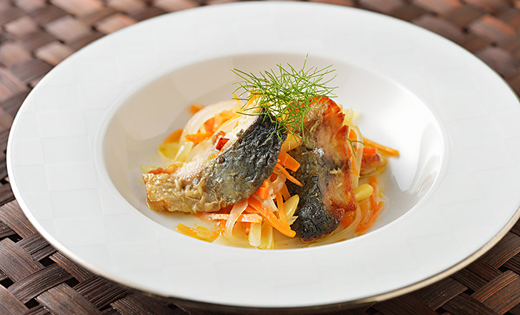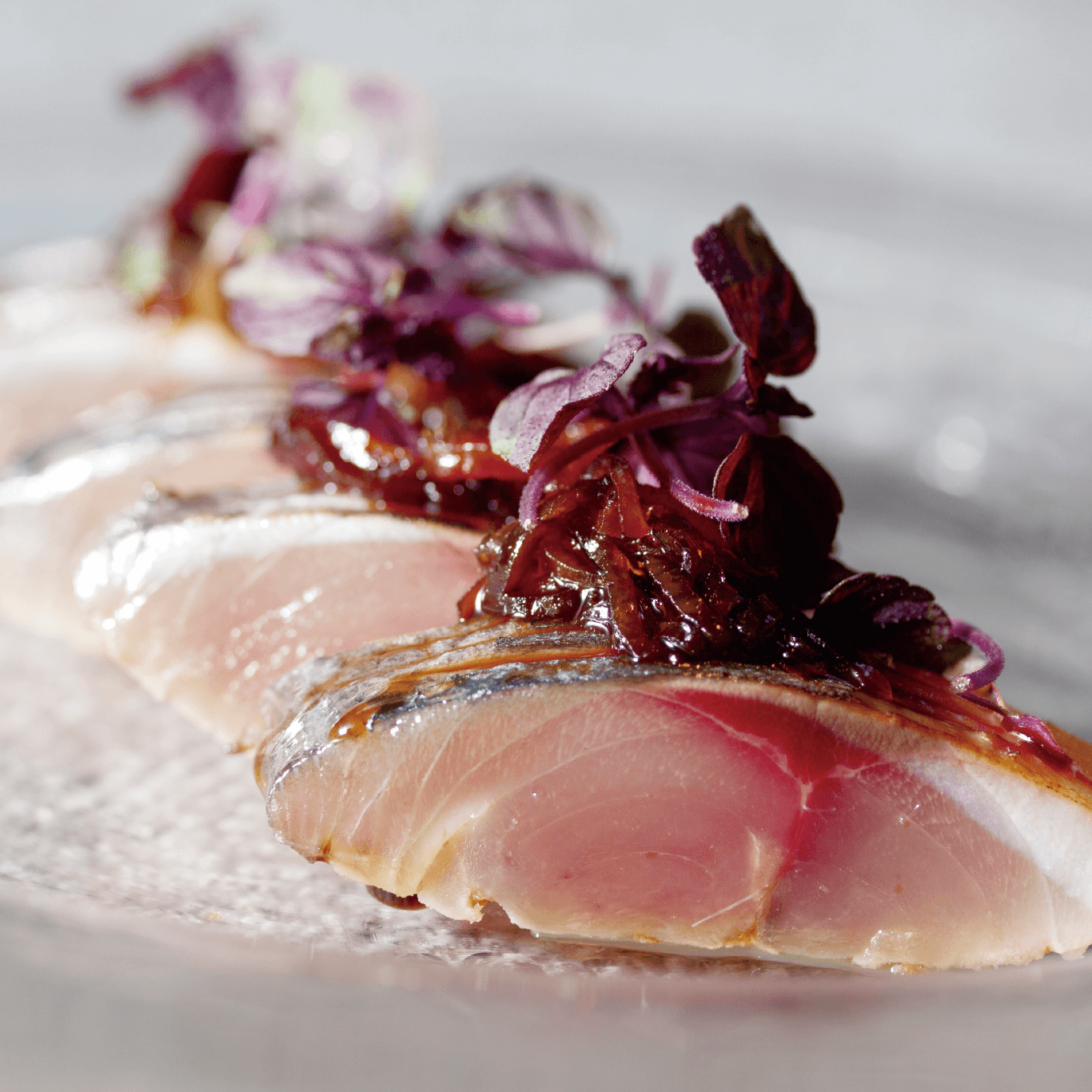 炙りしめ鯖を美しく 65 Maquereaux Marinés au Vinaigre de CidrePurée de Chou-Fleurà la Bonite。