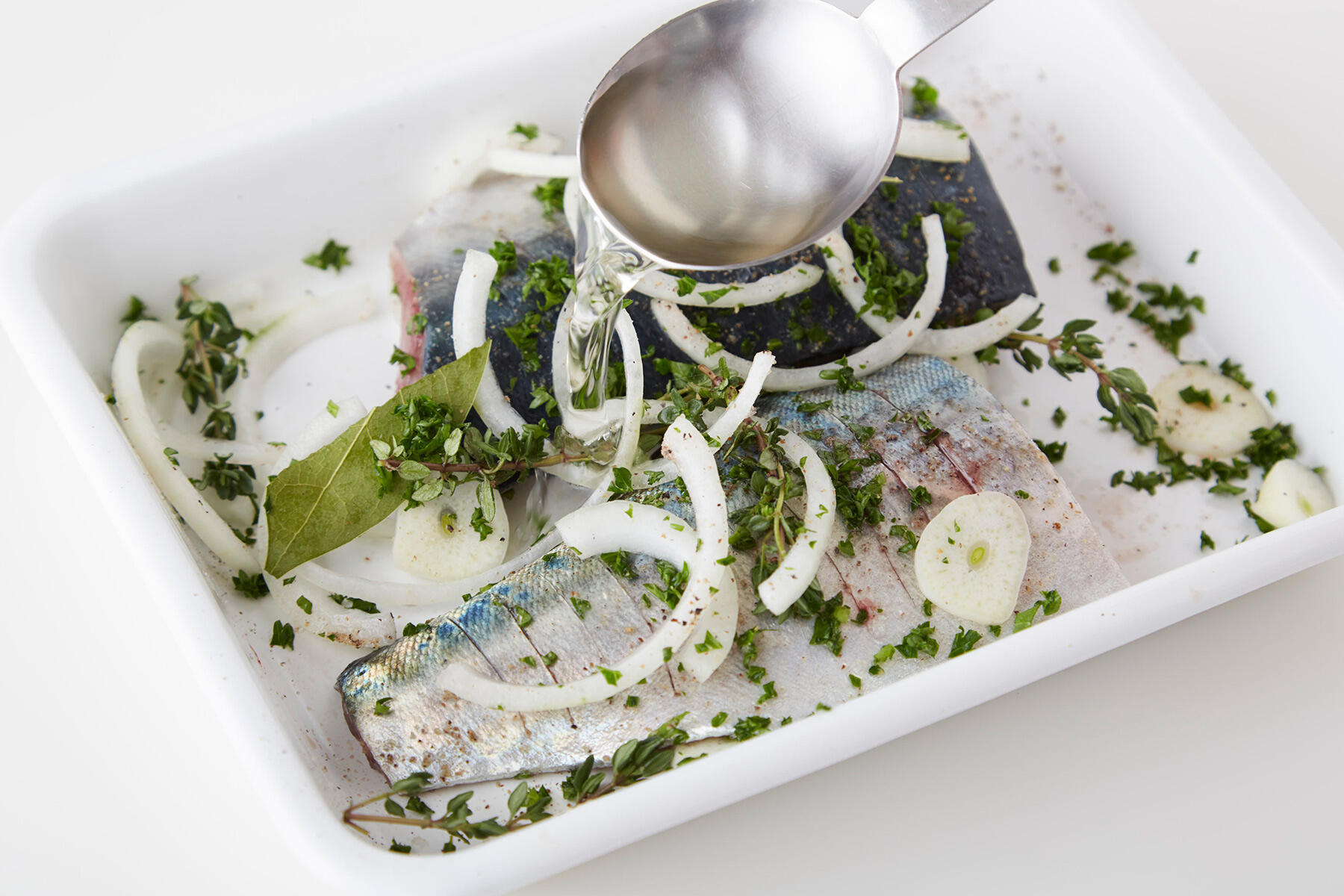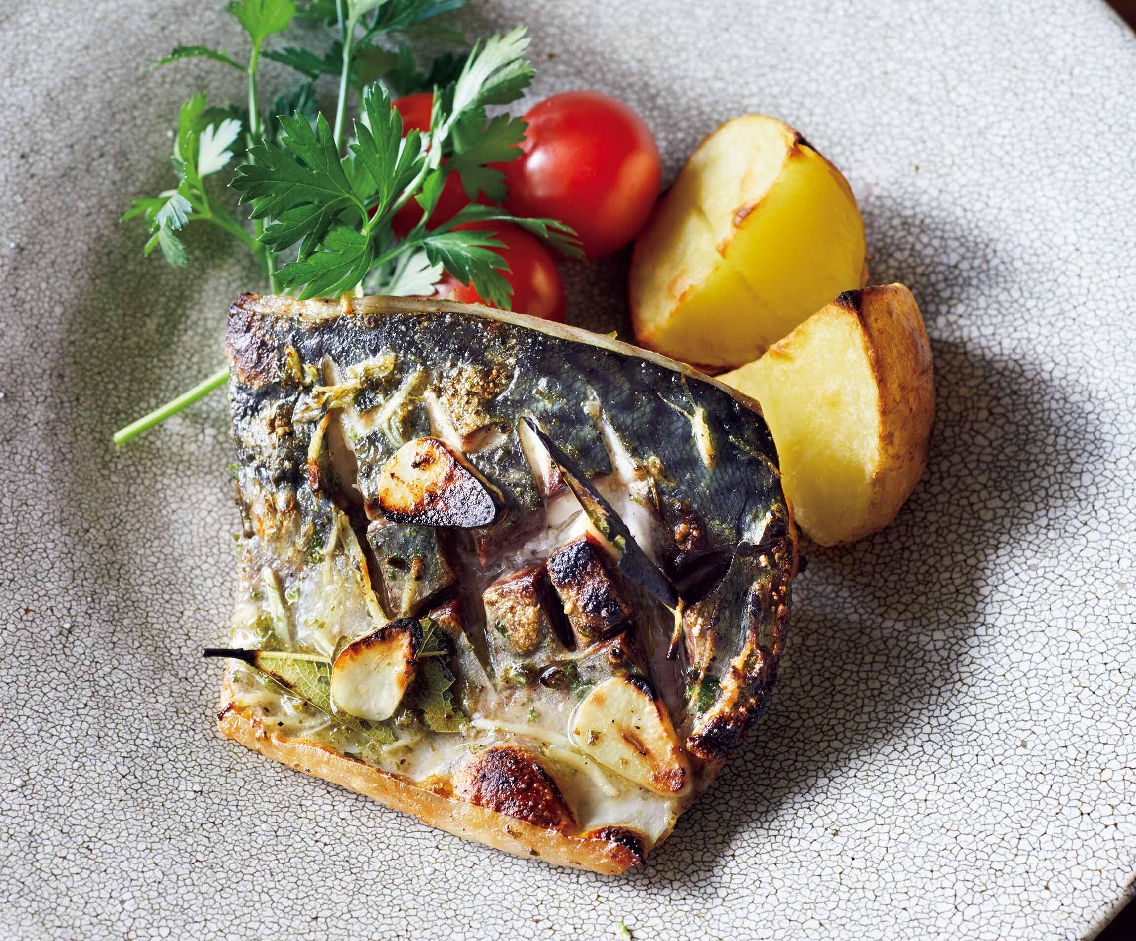 鯖のマリネ 焦がしネギのソース』 ①3枚におろした鯖に適量のグラニュー糖をまぶし、冷蔵庫で1時間置く。 ②出た水分をしっかり拭き取り、鯖の重量の2%の塩を振り、冷蔵庫で30分置く。③また水分をしっかり拭き、白ワインビネガーに1~1.5時間ほど漬ける。 ④焦がし。