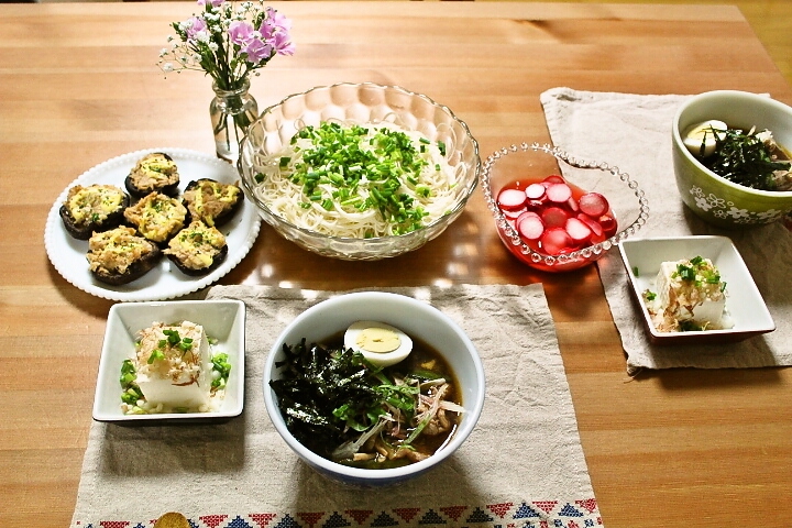 七夕に作りたいおもてなし献立♪ 3色薬味ツナだれそうめん。