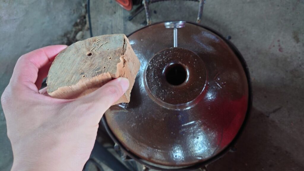 改造した醤油壺で壺焼き芋を作る! 自作した焼き芋壺でサツマイモを調理するよぴかりさん。