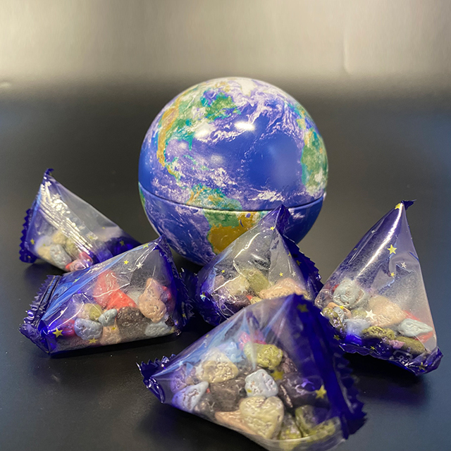 惑星の小石 チョコレートの空き缶 福岡市科学館 公式on X: "手のひらサイズの地球の中には 鉱石? 直径約8cmの美しい地球 の形をした缶の中には、鉱石の形をしたチョコレートが入っています。食べ終わった小さな地球。思わず飾っておきたくなります。5階ミュージアム。