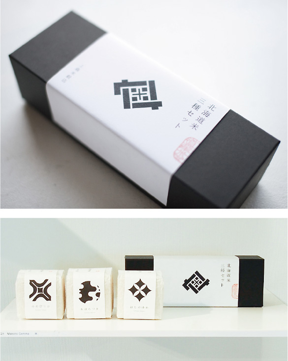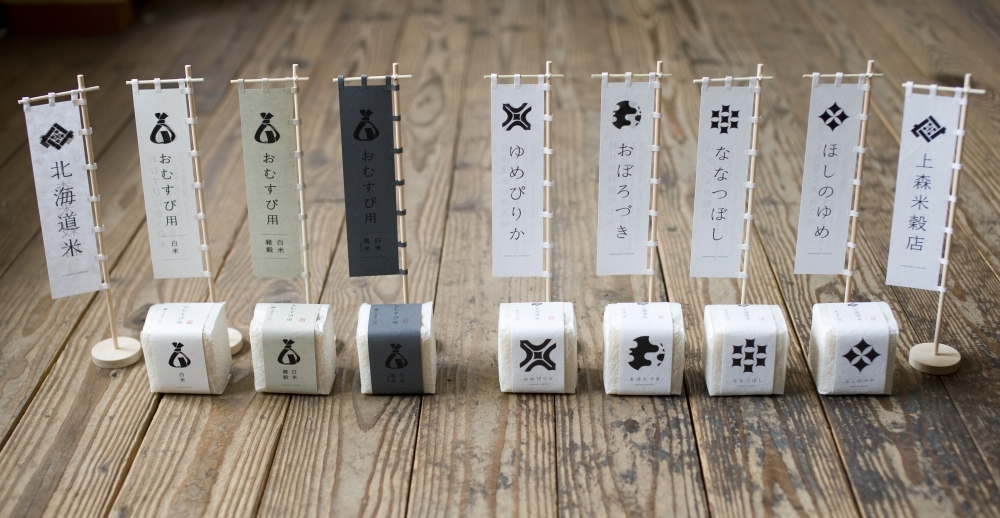 上森米穀店「北海道米」パッケージデザイン開発事例集JPDAライブラリ。