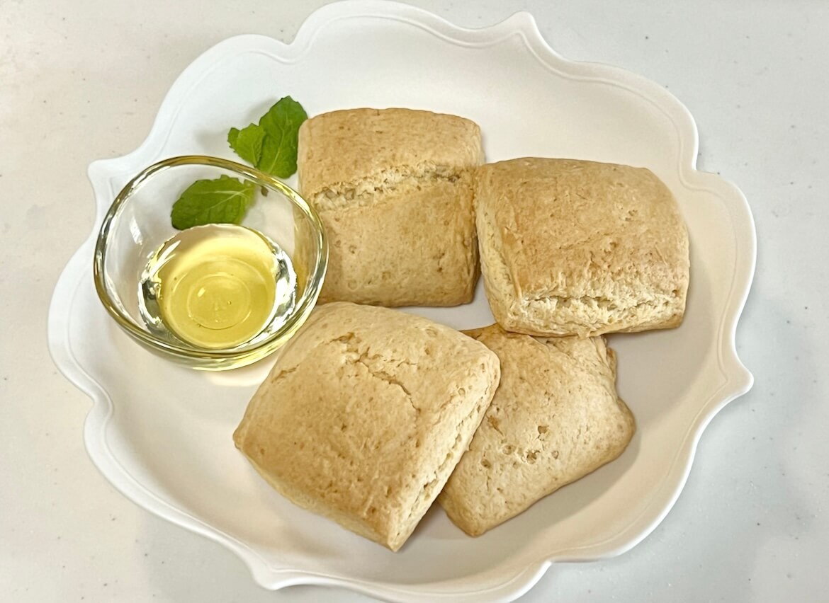 常温>米粉のパンケーキミックス自然をほおばるsola。