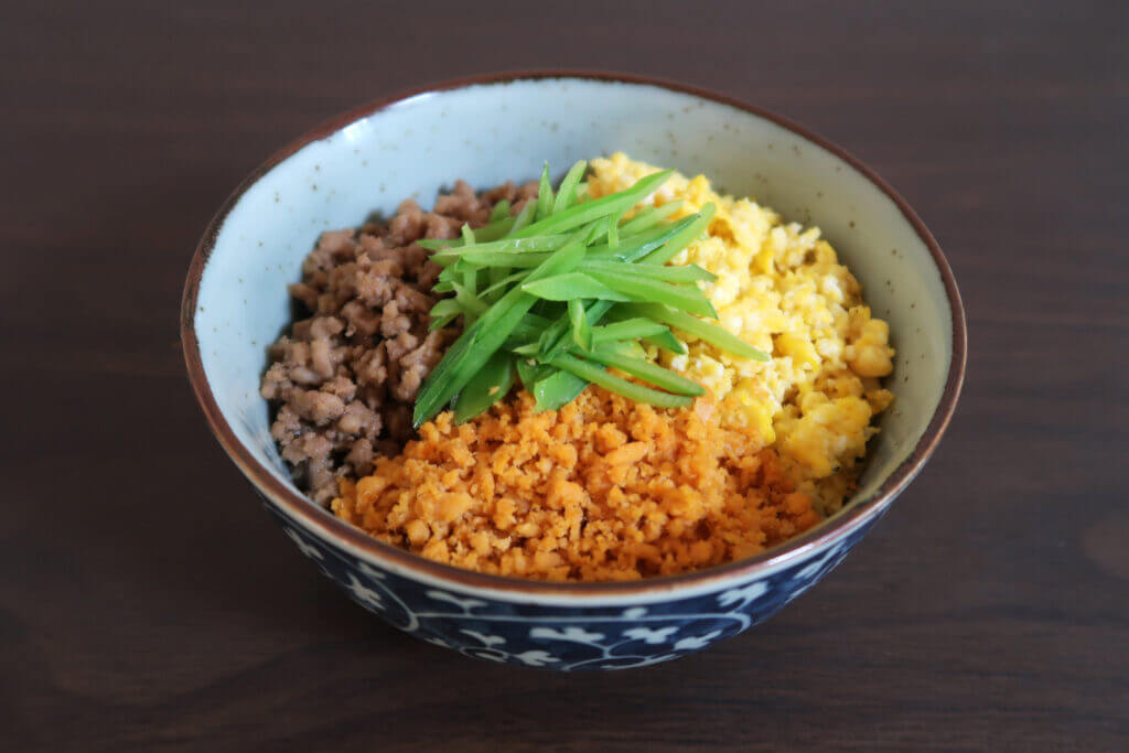 子供も食べやすい、鶏ひき肉の親子丼。野菜もたっぷり。