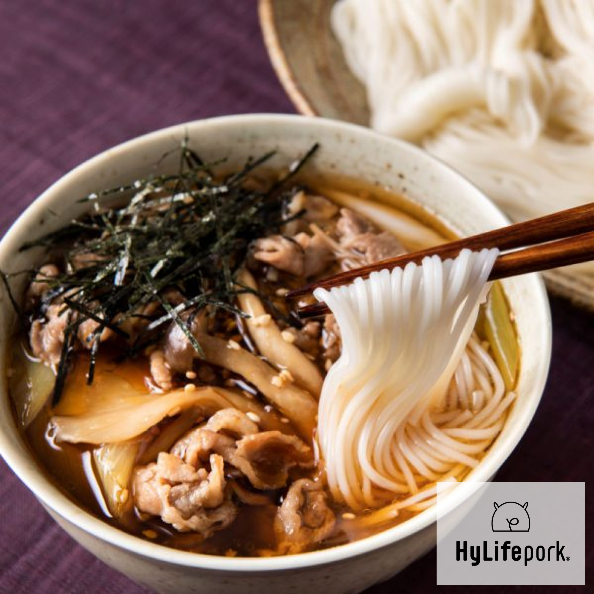 やみつき♪きのこ入り豚肉汁のつけそうめんハイライフポーク。