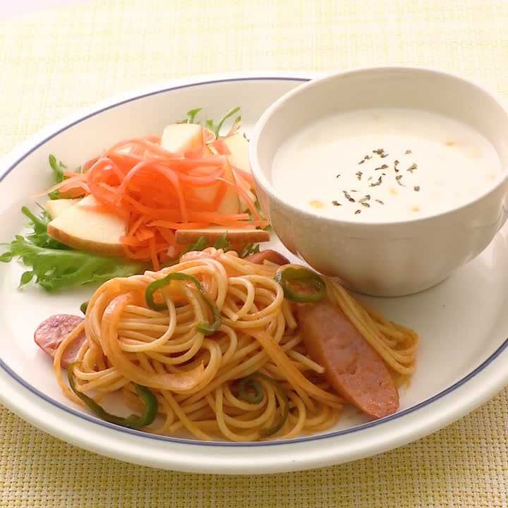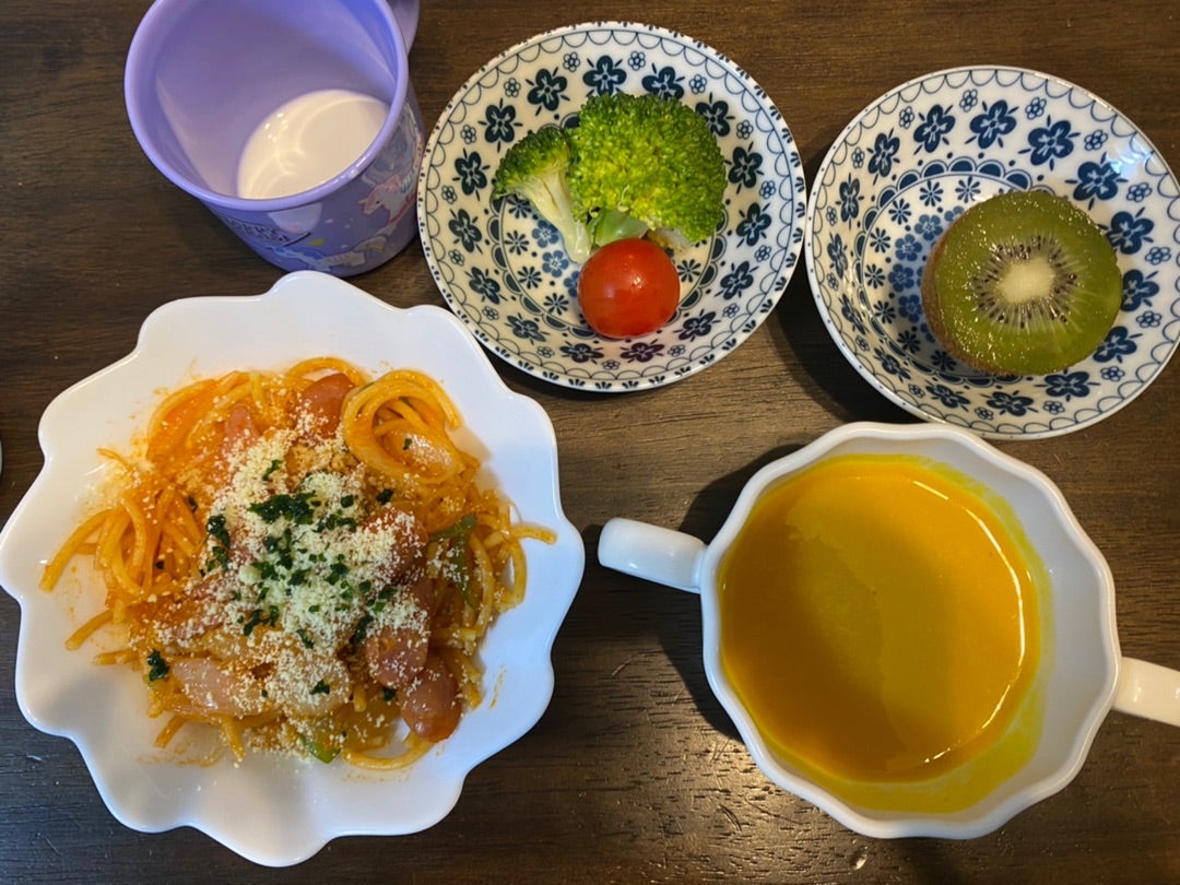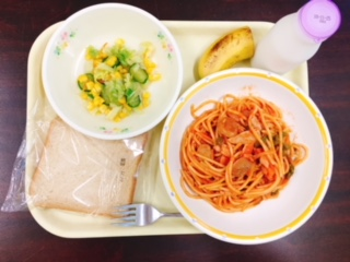 6月10日 月くもり時々晴 最高気温 22℃ スパゲティナポリタン、あさりとアスパラのミルクスープ、南瓜サラダ、アメリカンチェリー、牛乳2ヶ月に3回の麺の日。先月はスパゲティミートソースでしたので、今月はナポリタンにしました。ウインナーを使って、家庭的な味。