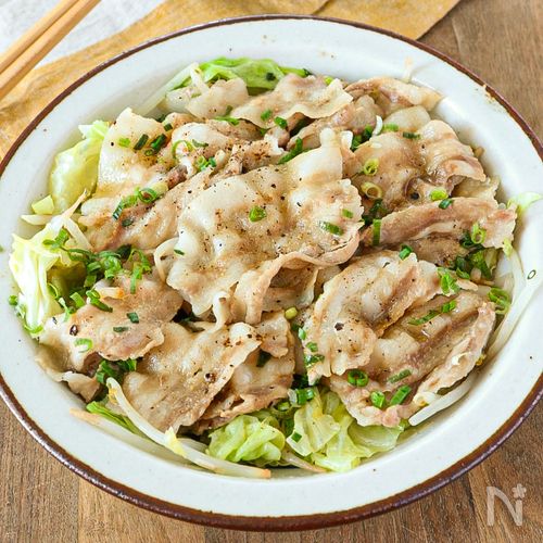 豚ばら肉ともやしキャベツのレンジ蒸し 調理も味付けも簡単♪。