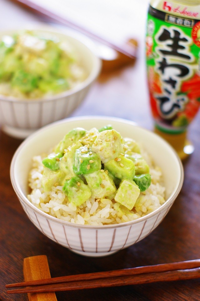 アボカドと鶏胸肉のマヨわさび醤油和え丼スパイス大使レシピ1894: のんびり毎日 日々の暮らしの食卓 いただきますのレシピ 時々 編み物。