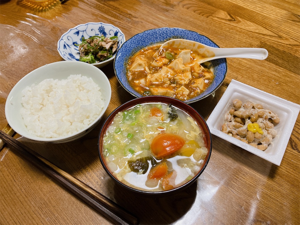 トマトと卵の中華スープに麻婆豆腐の朝ご飯。 - 外ごはん家ごはん。
