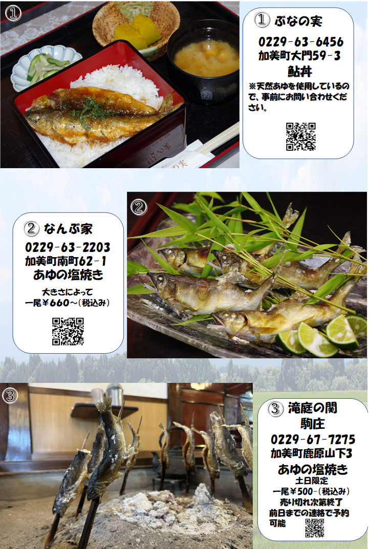 夏版 加美町名産「鮎」を食べられるお店について 加美町。