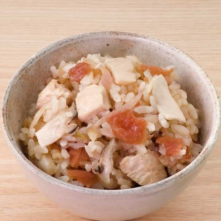 3合炊き炊飯器で! 鶏肉とエリンギの梅ポン酢炊き込みご飯。