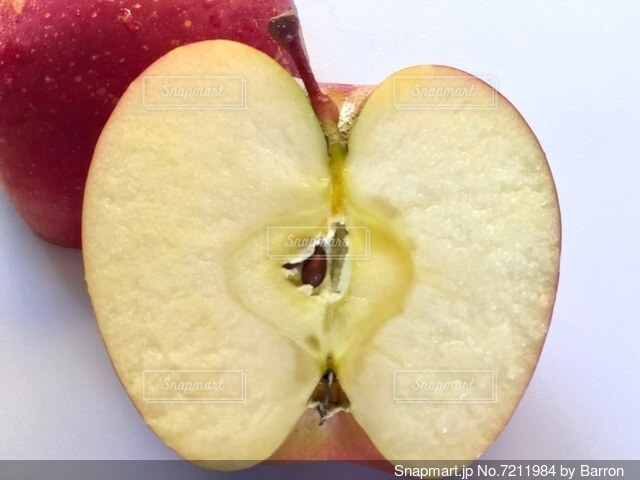 半分に切ったりんごの断面に見える、りんごの蜜の写真・画像素材-Snapmart スナップマート。