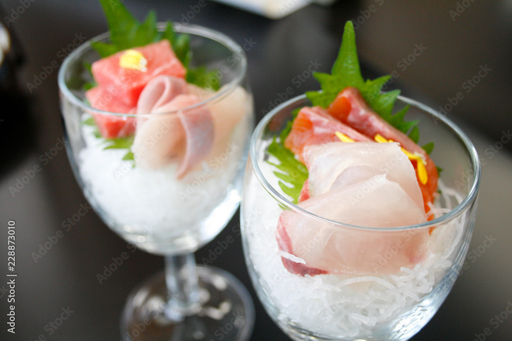 会席 魚 海 はまち 冬 刺身 お造り アップ グラス おしゃれ ズーム 料理 調理 懐石 盛り付け 和食 日本 雅 野菜 雅 一品 大葉 StockPhotoAdobe Stock。