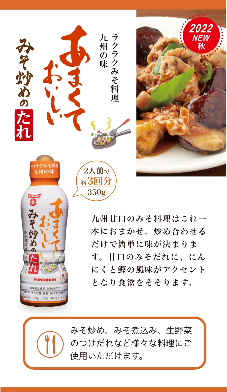 あまくておいしいみそ炒めのたれ醤油、味噌 本物の味ひとすじ フンドーキン醤油 九州大分県臼杵。
