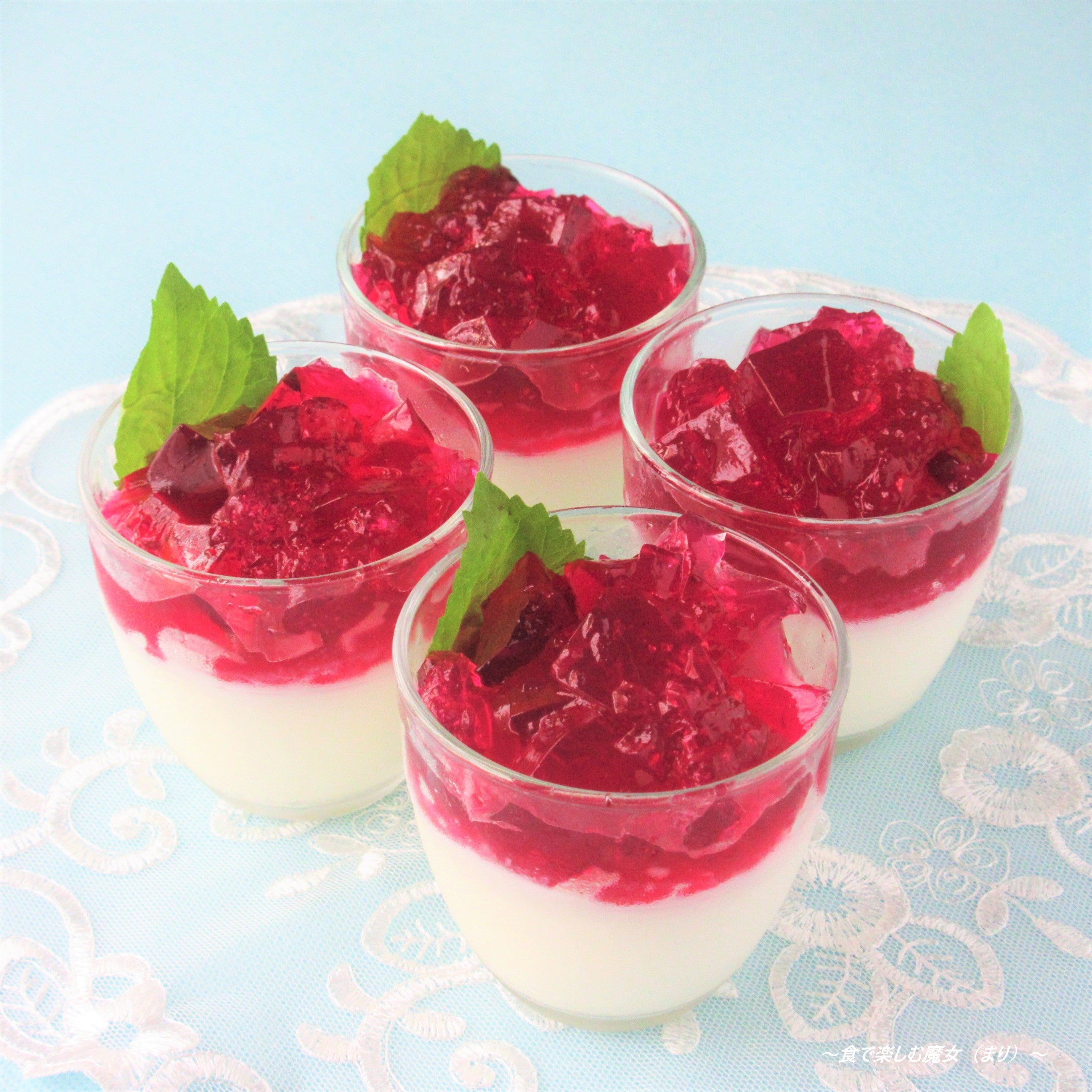 電子レンジで手軽に簡単♪綺麗でヘルシーなスイーツ。赤しそジュースと牛乳のゼリー『あじさいゼリー』食で楽しむ魔女♪野菜たっぷり彩りレシピ帳。
