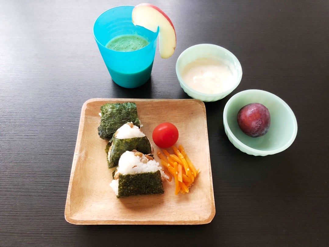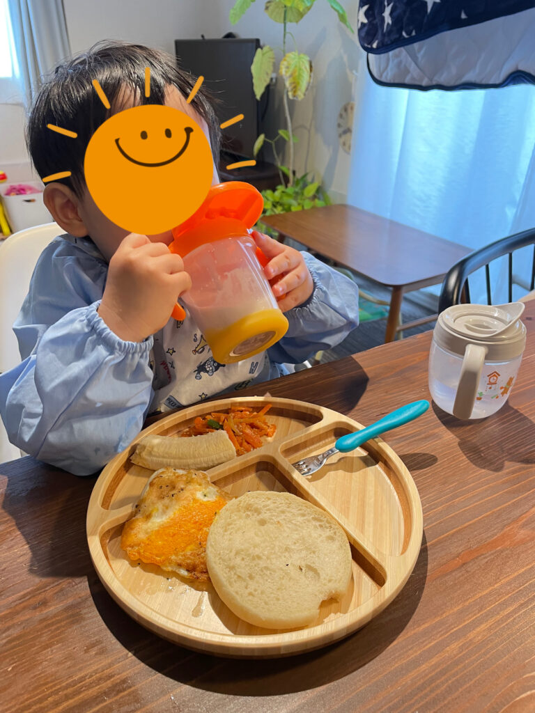⌇𝟣歳𝟣𝟢ヶ月 朝ごはん もうずっと朝ごはんは 同じメニューで固定なので たまーに違うメニューを 作った時の朝ごはんです 👆🏻´- 固定メニューはふりかけごはん、 お味噌汁か冷凍ストックのスープ、 野菜ジュース、フルーツ。 日によってたんぱく質のメニューを。