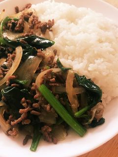 ☆豚ひき肉とほうれん草のスタミナ丼☆aiai日記。