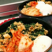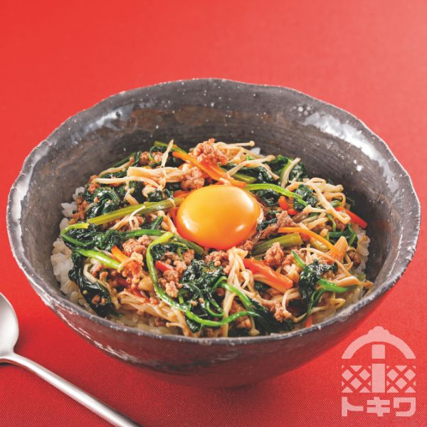 ほうれん草とひき肉のビビンパ風丼トキワさん家のキッチン。