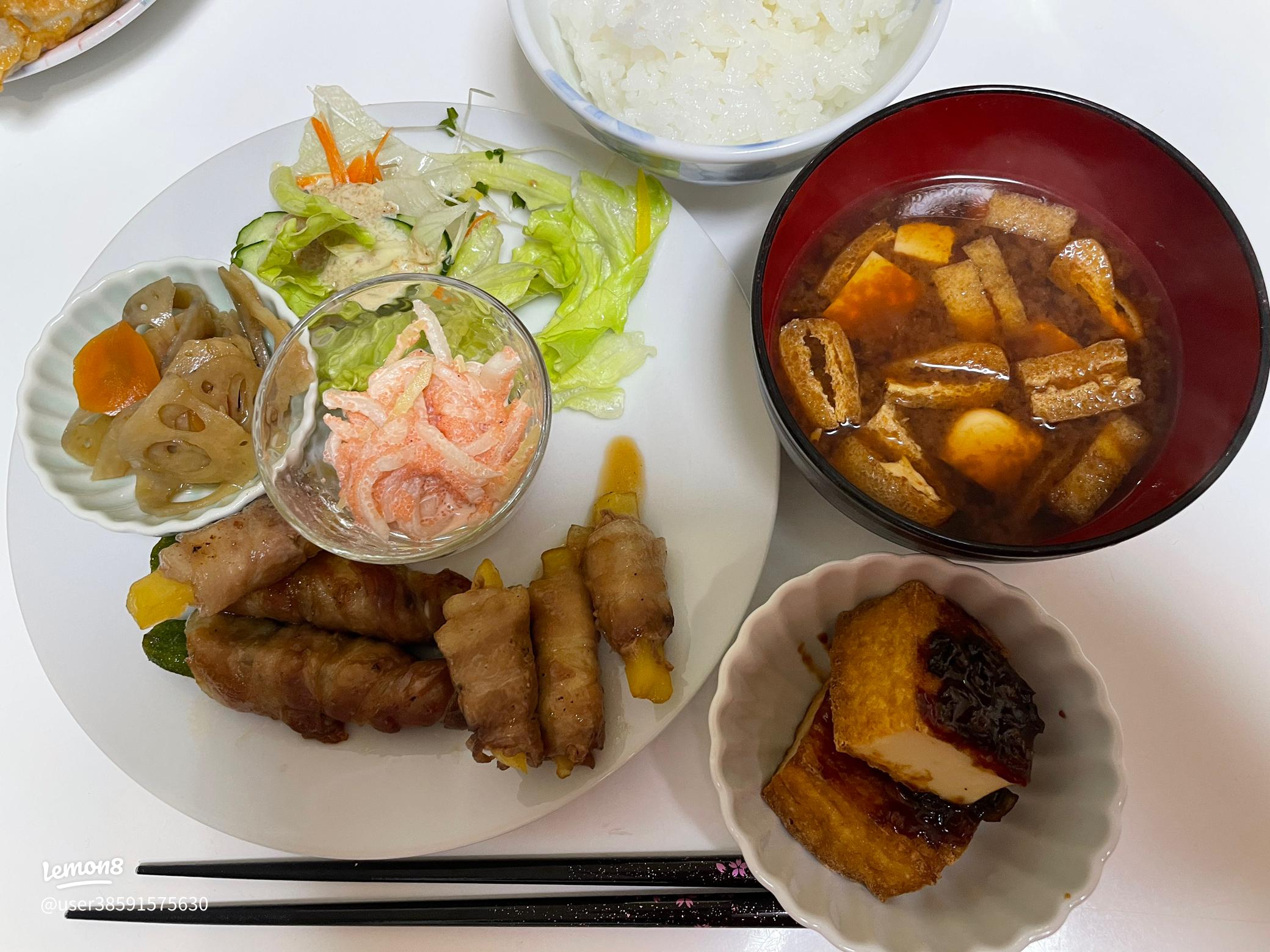 夜ご飯 📝 献立 *蓮根の肉巻きフライ *わかめのお味噌汁 *ほうれん草のお浸し *冷奴 *いちご 蓮根が花粉症に効くと聞いて早速🥹✨たくさん買って甘酢漬け、金平 冷凍ストック用 にした🙌 ▪︎レシピは後ほどブログにUPします。 ▪︎ブログはプロフィール欄より飛べ。