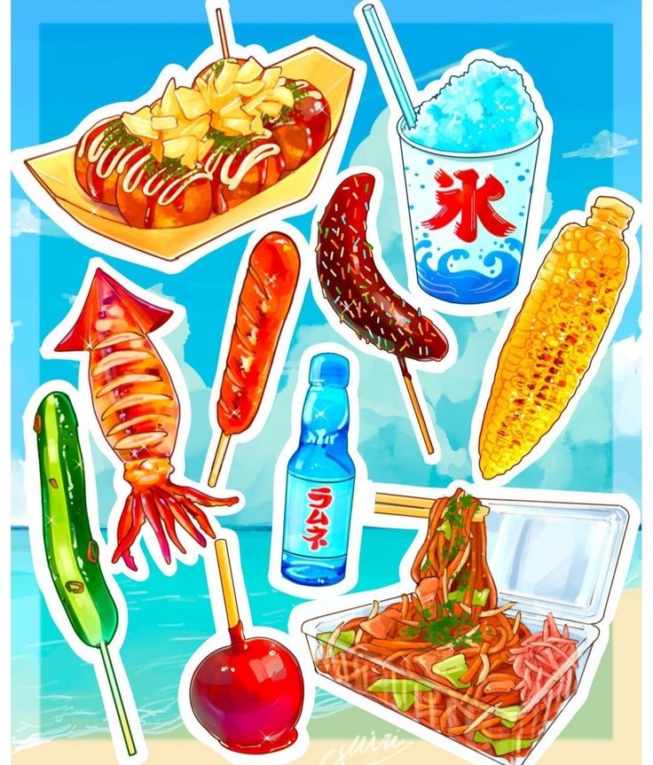 夏といえばお祭りということで屋台の食べ物を描いてみました!, お祭りといえばどんな食べ物が思い浮かびますか?, When we think ofsummer, festivals come to mind!, What kind of food comes to mind when youthink of festivals?,食べ物イラストイラストお祭り屋台屋台グルメ 夏。