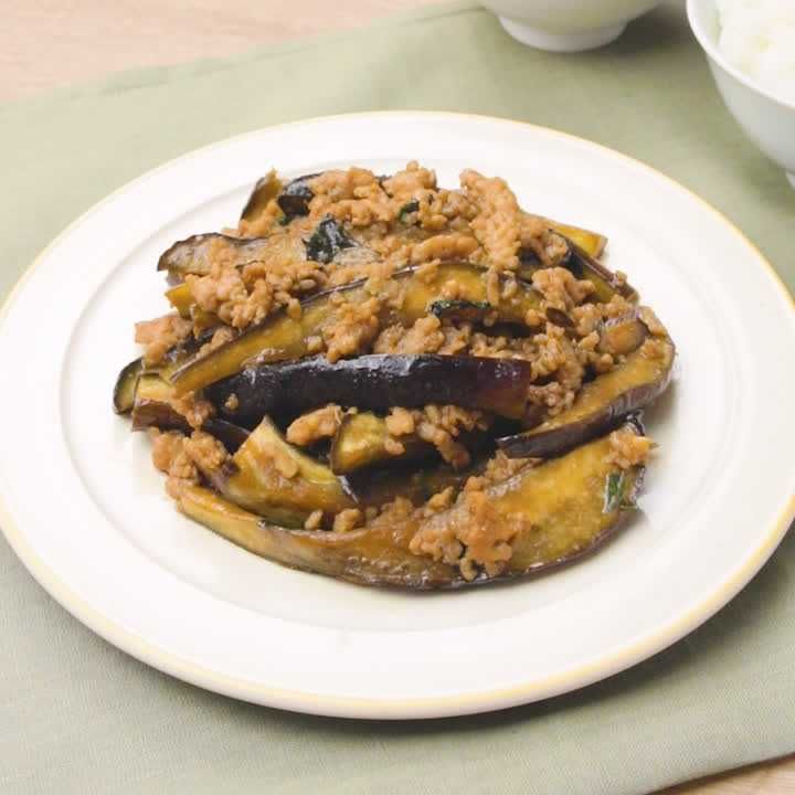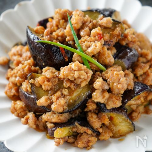 主材料2つ ナスがとろっ なす と 鶏ひき肉 の肉みそ炒め 味噌ダレが絡む 人気レシピ。