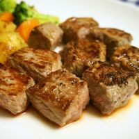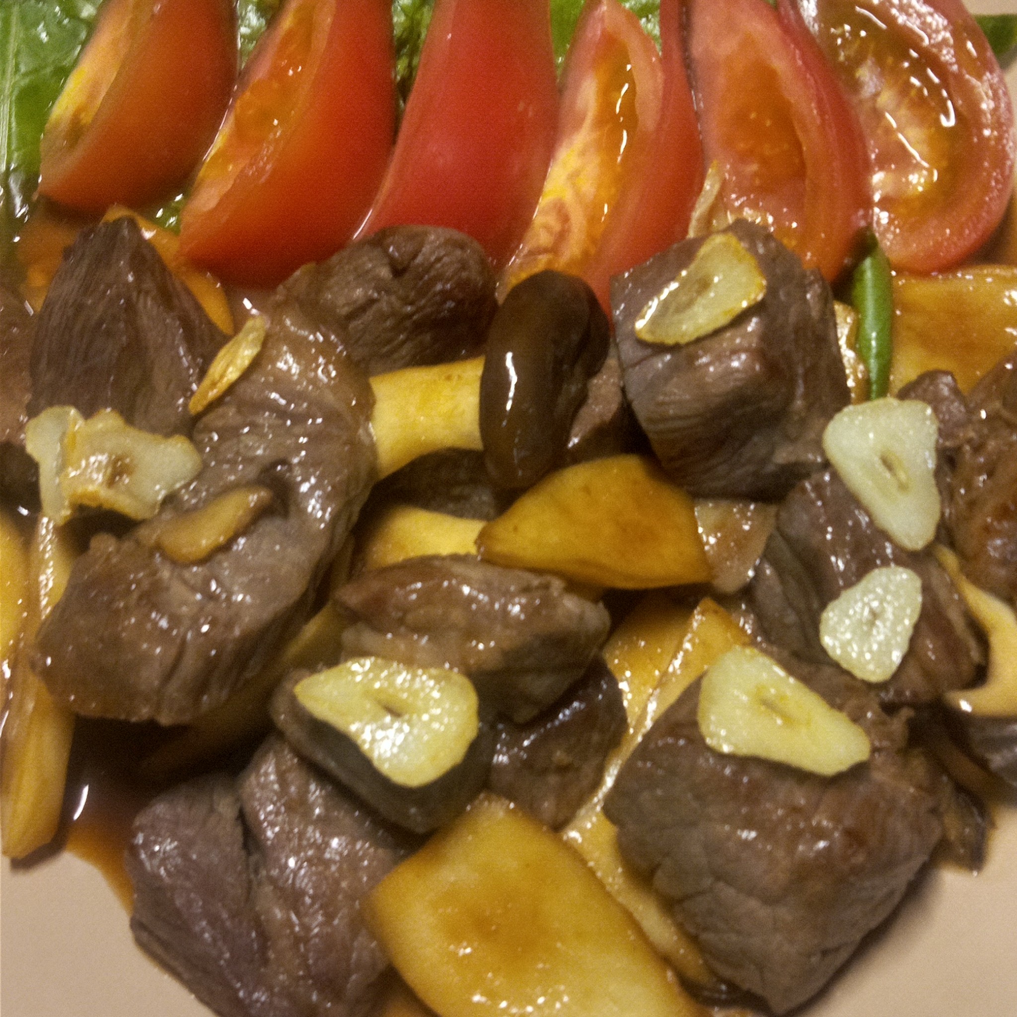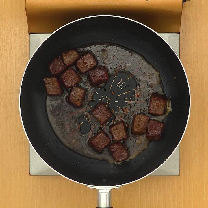 成型肉でもおいしくできる、牛のサイコロステーキ♪。
