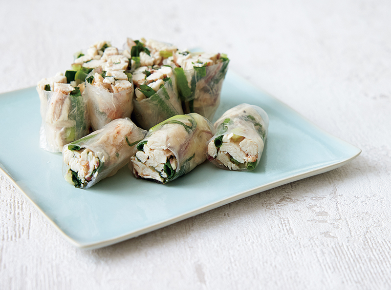 みそだれと相性バツグン! 蒸し鶏とみつばの生春巻き。