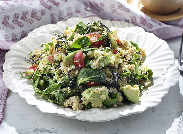 オーガニックベビーリーフとオートミールのカリフラワーライスサラダ。