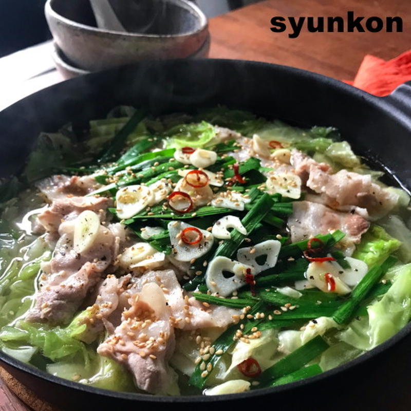 山本ゆり さんのもつ鍋風。忙しいときには最高!!!,具はキャベツ、しいたけ、にんじんひらひら、ささがきごぼう、油揚げ、絹豆腐、豚バラに、にんにくとやっこネギ。, 最後に中華麺も入れておいしかったー!,今年初の鍋。やっぱり鍋は最高だあ❤️,キャベツレシピ。
